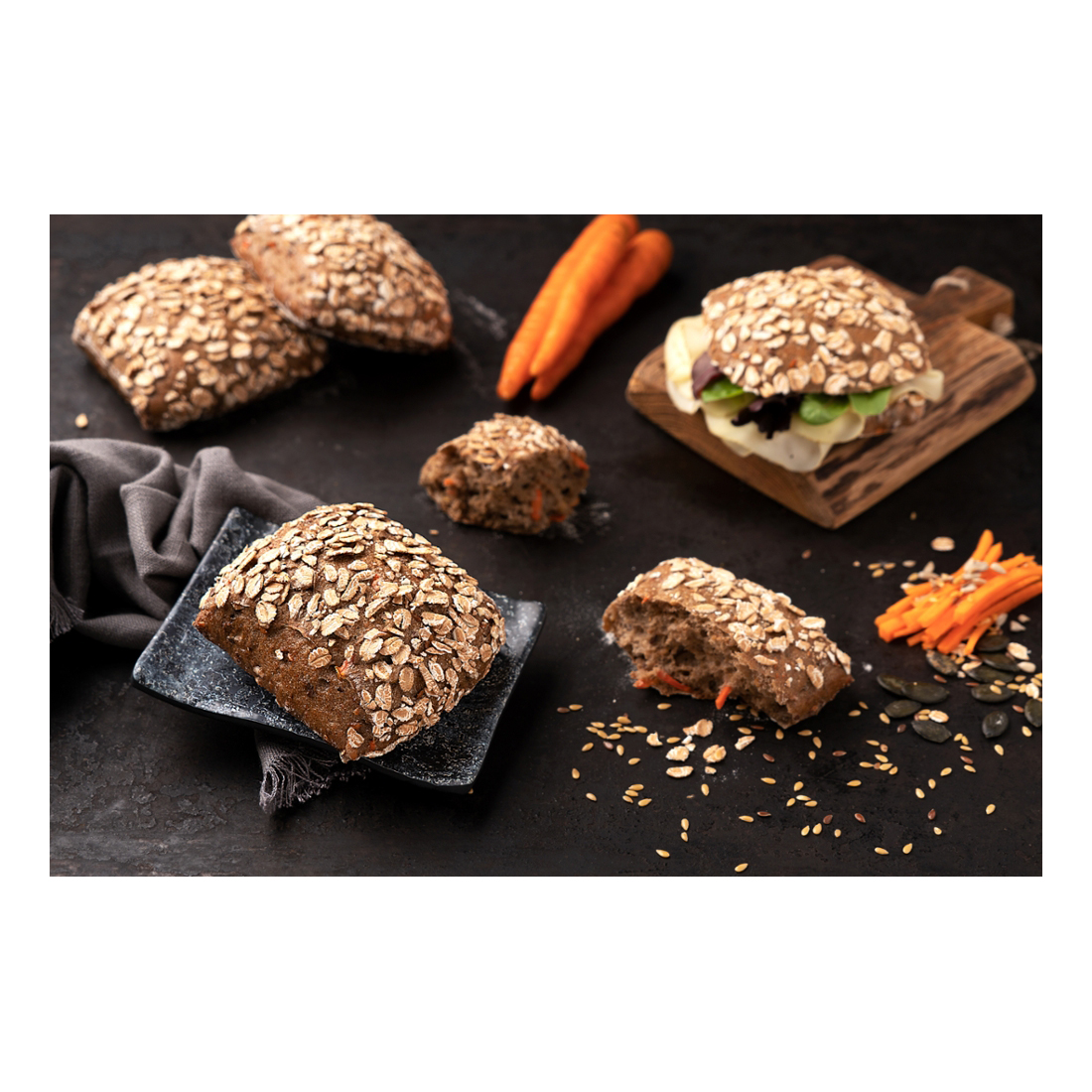 Wasser, DINKELMEHL* (25%), Körnermischung (13%) (Leinsaat braun*, Kürbiskerne*, Sonnenblumenkerne*, Leinsaat gold*), VOLLKORN-DINKELMEHL* (10%), Karottenstreifen* (8%), Meersalz, DINKELMALZ*, DINKELSAUERTEIG*, Apfelmus*, ROGGENRÖSTMALZ*, Hefe*,