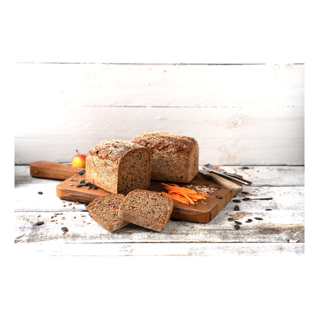Teig: Wasser, VOLLKORN-DINKELMEHL* (33%), Körnermischung (14%) (Leinsaat braun*, Leinsaat gold*, Kürbiskerne*, Sonnenblumenkerne*), Karotten* (8%), DINKELFLOCKEN*, VOLLKORN-DINKELSAUERTEIG*, Apfelmus*, DINKELMALZ*, Meersalz, Hefe*