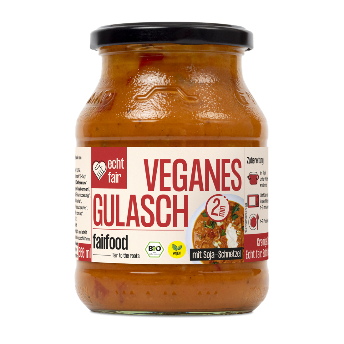 Wasser, rote Paprika* 8,5%, Soja-Schnetzel* 7%, Tomatenmark* 2-fach konzentriert, Zwiebeln* 4,3%, Cashewmus* 3,4%, Sojasoße* 2,2% (Wasser, Sojabohnen*, Salz), Sonnenblumenöl*, Salz, Balsamicoessig*, Zwiebeln geröstet*, Paprikapulver* geräuchert, Kokosblütenzucker*, Knoblauchpulver*, Verdickungsmittel: Johannisbrotkernmehl*, Pfeffer schwarz*, Kreuzkümmel*, Majoran*, Chili*.